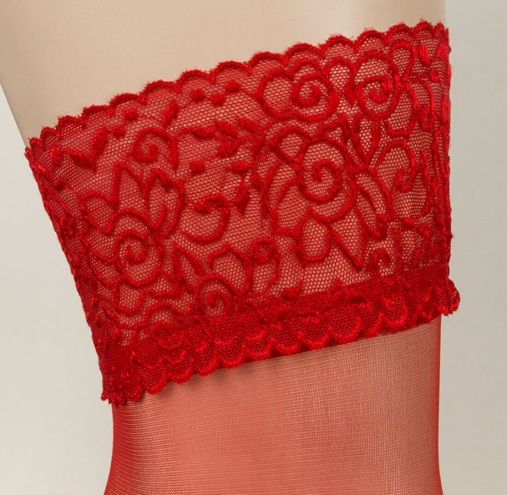 Vadító piros színben készült, fényesen csillogó, szaténos combfix, szexi, széles csipkeszegéllyel. Szilikonos megerősítéssel, hogy biztosan a helyén maradjon.